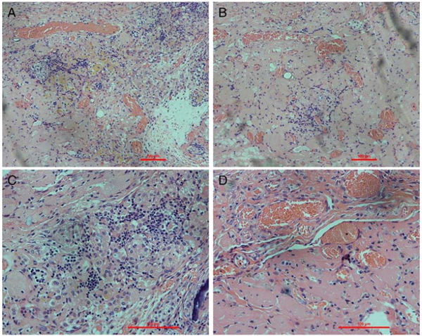 Figure 9: Histological examination of explanted renal ECM scaffolds. Hematoxylin and eosin staining of the explanted scaffolds shows intense inflammatory cell infiltration. Glomeruli structures are well visible and show inflammatory cell infiltration. Some vascular structures are occluded by thrombosis or filled with red blood cells.