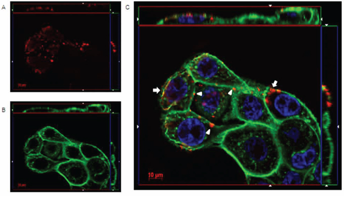Figure 4: IgGH6 binds claudin3 on USPC-4 cell surface. USPC4 cells were incubated 1 h at 4°C with 2.5 μg/mL of IgGH6 to prevent antibody internalization, then cells were fixed, permeabilized, and incubated with the Alexa594-conjugated secondary antibody (red) panel A. Cell membrane and nuclei were stained with WGA-Alexa488 (green) panel B and DAPI (blue), respectively. Images were collected using a Zeiss Axiovert 200M epifluorescence microscope equipped with a Plan-Apochromat 63x/1.4 NA oil objective; z-stack images were acquired using ApoTome system and elaborated Inside4D module. panel C shows images resulting from merging the three different channels. IgGH6 binding at the cell-cell contact (arrowhead) and on the cell surface outside the TJ area (arrow) are visualized.