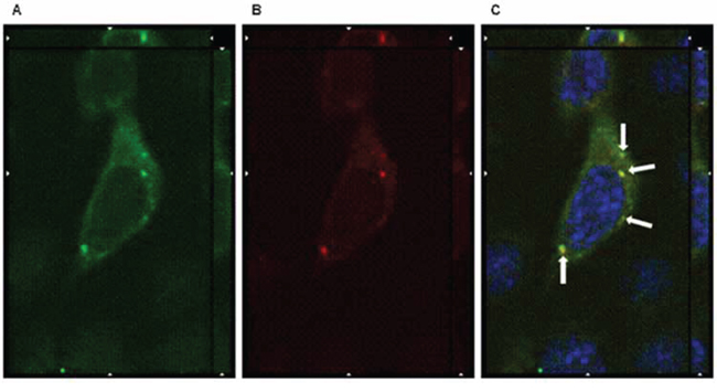 Figure 6: IgGH6 internalizes with CPE290–319 peptide. OSPC-2 cells were incubated 1 h at 37°C with 2.5 μg/mL of IgGH6 in the presence of [10 μg/mL] FITC-CPE290–319 peptide (green) panel A to allow antibody and peptide internalization, then cells were fixed, permeabilized and incubated with the Alexa594-conjugated secondary antibody (red) panel B. Nuclei were stained with DAPI (blue). Images were collected using a Zeiss Axiovert 200M epifluorescence microscope equipped with a Plan-Apochromat 63x/1.4 NA oil objective; z-stack images were acquired using ApoTome system and elaborated Inside4D module. panel C shows images resulting from merging the three different channels, with arrows showing IgGH6 and CPE peptide colocalization in the cell cytoplasm.