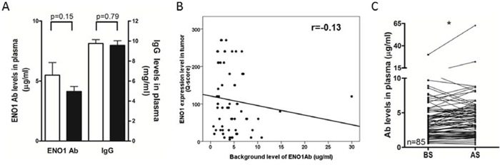 Figure 1: Levels of circulating anti-ENO1 Ab in NSCLC patients before and after tumor removal. A. Plasma from healthy donors (white bars, n = 36) and NSCLC patients (black bars, n = 85) were collected and the levels of anti-ENO1 Ab and total IgG were quantified by ELISA. Bars represent mean ± SEM. Statistics were performed using Student's t test. B. Correlation between the expression of ENO1 in tumors and the level of anti-ENO1 Ab in plasma of patients before surgery. Statistics were performed using Pearson's Correlation Coefficient analysis. C. Plasma from the same patients were collected before and 1 month after surgery to remove the tumor. The level of anti-ENO1 Ab in the plasma was determined by ELISA. Each line indicates the change in the plasma level of anti-ENO1 Ab in the same patient (n = 85) before and after surgery. Statistics were performed using one tailed paired t-test. *P < 0.05. AS, after surgery; BS, before surgery; ENO1, α-enolase.