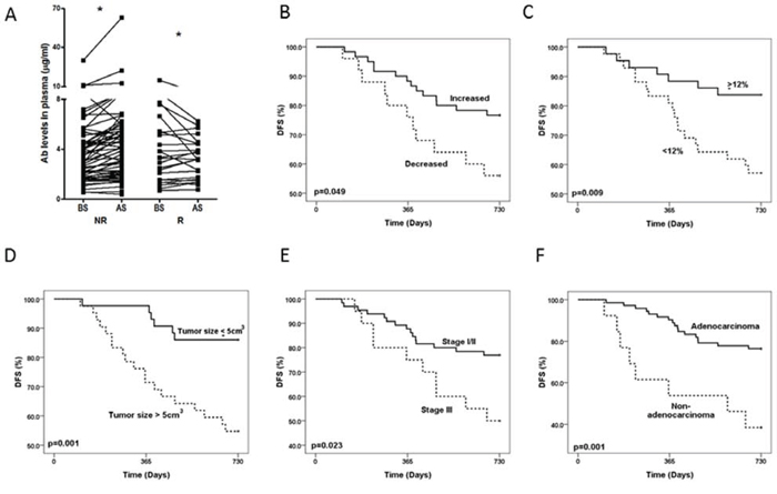 Figure 2: Changes in the level of anti-ENO1 Ab in patients with or without recurrence and Kaplan-Meier analysis of 2-year DFS. A. Plasma from the same patients were collected before and 1 month after surgery. The level of anti-ENO1 Ab in the plasma was determined by ELISA. Each line indicates the change in the plasma level of anti-ENO1 Ab in the same patient before and after surgery. NR: patients with no tumor recurrence in two years (n = 60); R: patients with tumor recurrence in two years (n = 25). AS, after surgery; BS, before surgery. Statistics were performed using one tailed paired t-test. *P < 0.05. Kaplan-Meier analysis of 2-year DFS was stratified according to: B. the variation in the level of anti-ENO1 Ab before and one month after surgery. C. Lower (<12%) or higher (≥12%) increase of anti-ENO1 Ab. D. Tumor size (≤5 cm3 and > 5 cm3). E. pTNM stage (stage I/II and stage III). F. Histology subtype (adenocarcinoma and non-adenocarcinoma).