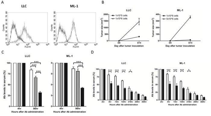 In order to study the effect of tumor volume on the serum level of anti-ENO1 Ab, groups of BALB/c mice were s.c. implanted with 5 × 106 ML-1 cells on their the right flanks on day 0 or with 1 × 106 ML-1 cells on day 7; and groups of C57BL/6 mice were s.c. implanted with 1 × 105 or 1 × 106 LLC cells on day 0. The tumor volume was estimated using the modified ellipsoid formula (π/6 × [length × width2]) [15]. On day 14, 400 μg of anti-ENO1 Ab was adoptively transferred into groups of tumor-bearing and tumor-free mice by i.v. injection. The sera were collected at each indicated time point, and the levels of anti-ENO1 Ab were determined by ELISA.