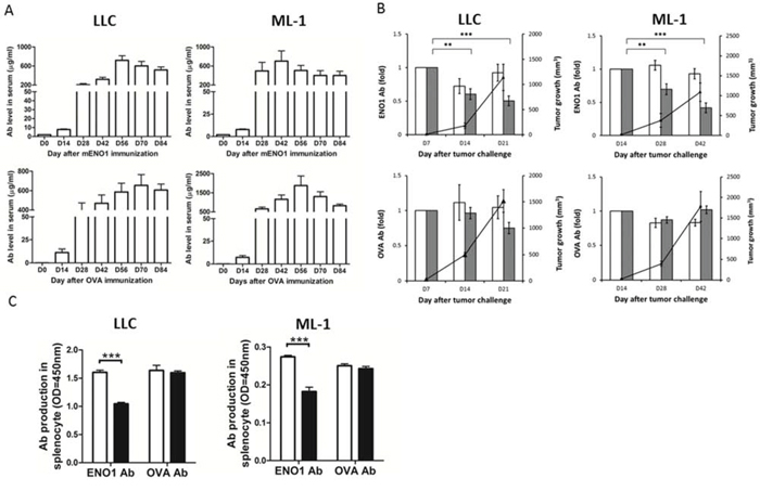 We further determined that there is a significant reduction in the production of anti-ENO1 Ab by splenocytes of mice vaccinated with ENO1 and transplanted with LLC or ML-1 cells. No reduction of anti-OVA Ab was observed in tumor-bearing mice vaccinated with OVA (Figure 4C).