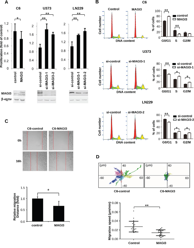 Figure 2: MAGI3 reduces cell proliferation, arrests the cell cycle, and inhibits the migration of glioma cells. A. Effect of MAGI3 expression on glioma cell proliferation. Control vector or MAGI3-transfected C6 cells and control or MAGI3 siRNA-transfected U373 and LN229 cells were respectively cultured in 96-well plates and stained with CCK8 at 48 h (for C6 cells) or 96 h (for U373 and LN229 cells). Growth of C6 (left panel), U373 (middle panel) and LN229 (right panel) cells was assessed by measuring absorbance at 450 nm with a spectrophotometer. Values are expressed relative to the absorbance in control vector or a scrambled control siRNA-transfected cells. B. Effect of MAGI3 expression on cell cycle progression. Cell cycle analysis was performed using propidium iodide DNA staining and flow cytometry. The percentages of C6 (top panel), U373 (middle panel) and LN229 cells (bottom panel) at G0/G1, S, or G2/M phases were determined. Left panel: Representative cell cycle distribution. Right panel: The percentage of cells in different cell cycle phases. C. Effect of MAGI3 expression on cell migration in wound-healing assays. Scratch wounds were created in monolayers of control or MAGI3-transfected C6 cells at 0 and 16 h of culture (top panel). The relative migration distance was quantified (bottom panel). (A–C) Data represent the mean ± SD of 3 individual experiments. D. Effect of MAGI3 expression on cell migration in two dimensional migration assays. C6 cells transfected with control vector or GFP-MAGI3 were assayed for cell migration. The positions of individual cells were tracked by fluorescence microscopy and recorded every 5 min for 8 h. Top panel: Representative XY migration tracks of two different C6 cells. Bottom panel: Analysis of the migration speed of cells. Each group included 21 cells. Data were analyzed by two-tailed paired Student’s t-test. Error bars represent SD. *P < 0.05, **P < 0.01, with respect to the cells transfected with control vector or siRNA.