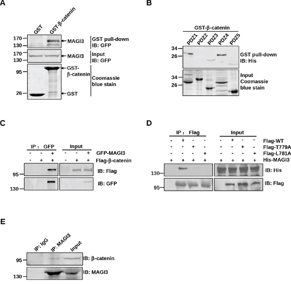 Figure 3: MAGI3 interacts with β-catenin via its PDZ domains and PDZ-binding motif of β-catenin. A. Association of β-catenin with full-length MAGI3 in vitro. GST or GST-β-catenin fusion proteins were used to pull down GFP-tagged full-length MAGI3 from transfected COS-7 cell lysates. The pulled down MAGI3 was detected by western blotting with an anti-GFP antibody (top panel). Coomassie blue staining showed equal loading of the GST fusion proteins (bottom panel). B. Binding of β-catenin to multiple PDZ domains of MAGI3. GST-β-catenin fusion proteins were used to pull down His-MAGI3 PDZ1–5 fusion proteins respectively. Precipitates were subjected to western blotting with anti-His antibody (top panel). Coomassie blue staining of His-MAGI3 PDZ fusion proteins used in the pull-down assay (bottom panel). C. Interaction of β-catenin with MAGI3 in COS-7 cells. COS-7 cells were transfected with Flag-β-catenin and/or GFP-MAGI3. Cell lysates were immunoprecipitated with anti-GFP antibody, fractionated by SDS-PAGE, and immunoblotted with anti-Flag (top panel) or anti-GFP antibodies (bottom panel). D. Interaction of β-catenin with MAGI3 via its PDZ-binding motif. COS-7 cells were transfected with His-MAGI3 and wild-type Flag-β-catenin (WT) or its point mutants (T779A and L781A). Cell lysates were immunoprecipitated using an anti-Flag affinity gel, and immunoblotted with anti-His (top panel) or anti-Flag antibodies (bottom panel). E. Binding of MAGI3 to β-catenin in glioma cells. Lysates from C6 cells were subjected to immunoprecipitation with anti-MAGI3 antibody and immunoblotting with anti-β-catenin or anti-MAGI3 antibodies.