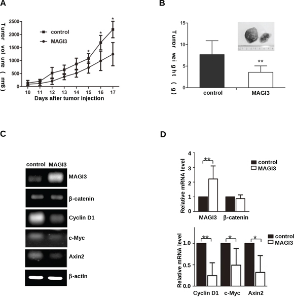 Figure 6: MAGI3 inhibits C6 glioma cell growth and β-catenin target gene expression in xenograft tumors. A. Growth rate of subcutaneous rat C6 glioma cell tumors. Control or MAGI3-tranfected C6 cells were subcutaneously injected into nude mice. Tumor size was measured daily. Values are expressed as the mean ± SD of 7 tumors in each group. B. Weight of the tumors produced by C6 glioma cells. Mice were sacrificed at a minimum of 17 days after transplantation, and xenograft tumors were dissected and individually weighed. C–D. Negative correlation between MAGI3 and β-catenin target gene expression in C6 tumors. Total RNA was isolated from dissected tumor samples. The expression of MAGI3, β-catenin, Axin2, c-Myc, Cyclin D1 and β-actin mRNA was analyzed by reverse-transcription PCR. β-actin was used as the internal loading control. (C) Representative image from 7 tumor samples. (D) The expression of the indicated genes in the figure was quantified and expressed as fold change compared to the control. Values are expressed as the mean ± SD of 7 samples. *P < 0.05, **P < 0.01.
