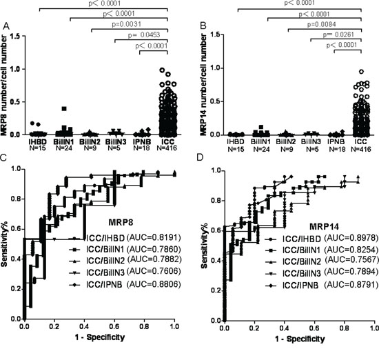 Figure 2: The MRP8 and MRP14 expression level in IHBD, BilIN1, BilIN2, BilIN3, IPNB, ICC and the ROC curve. A scatter plot of MRP8 A. and MRP14 B. positive cells to the total number of biliary epithelial cells was obtained from the TMAs. Mann-Whitney test showed a significant difference between ICC and IHBD, BilIN1, BilIN2, BilIN3, IPNB. ROC curve analyses and AUC showed that MRP8 C. and MRP14 D. have good performance to distinguish ICC from IHBD, BilIN1, BilIN2, BilIN3, IPNB.