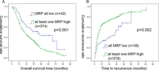 In the prognostic group, among 416 patients at the last follow-up, 309 had died and 319 had tumor recurrence. To enhance the prognostic value, the expression level represented by MRP8 and MRP14 positive cells to the biliary epithelial cell number was combined. Kaplan-Meier analysis in both the primary cohort and the testing cohort showed that the overall survival (OS) and time to recurrence (TTR) rates were statistically better in the combined low-MRP group than those in at least one high-MRP group, with the exception of OS in the testing group (P = 0.041 for OS and P = 0.020 for TTR in primary cohort; P = 0.067 for OS and P = 0.047 for TTR in testing cohort, Supplementary Figure S3).