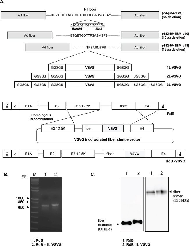 Figure 1: Construction of VSVG epitope-incorporated fiber-modified oncolytic Ads. A. To construct VSVG-incorporated oncolytic Ad (RdB-VSVG), 9 variants of fiber shuttle vectors were constructed and utilized for homologous recombination with viral total oncolytic Ad vector (RdB). B. Polymerase chain reaction (PCR) analysis of a fiber-modified Ad (RdB-1L-VSVG). The fiber genotype was confirmed by PCR amplification with primers specific for the fiber. The 713 or 800 bp fiber genes from RdB (lane 1) or RdB-1L-VSVG (lane 2) were amplified respectively. Left lane is a DNA marker with 1-kb DNA ladder. C. Western blot analysis. A549 cells were infected with RdB or RdB-1L-VSVG at MOI of 10. Fiber monomer and trimer were observed under either denaturing or non-denaturing condition, respectively. Cell lysates were probed with antibodies against Ad fiber knob.