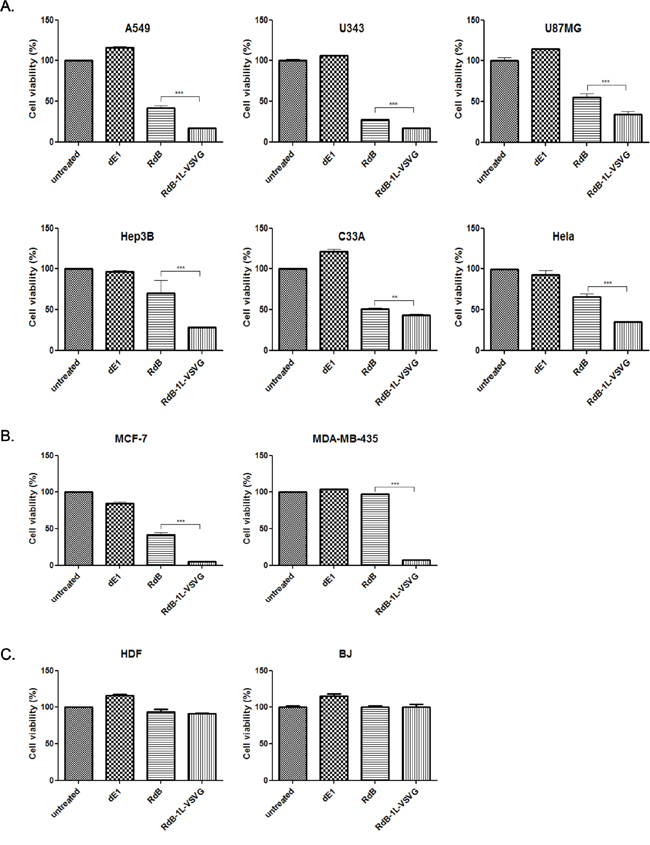 Figure 2: Cancer cell killing effect of RdB-1L-VSVG. A. MTT assay in CAR-positive cancer. CAR-positive various cancer cells (A549, U343, U87MG, Hep3B, C33A, and Hela) were treated with dE1, RdB, or RdB-1L-VSVG. At 2–4 days post infection, MTT assay was performed. B. MTT assay in CAR-negative cancer. CAR-negative cancer cells (MCF7 and MDA-MB-435) were treated with PBS, dE1, RdB, or RdB-1L-VSVG. At 4 days post infection, MTT assay was performed. C. MTT assay in normal fibroblast cells. Normal fibroblast cells (HDF and BJ) were treated with PBS, dE1, RdB, or RdB-1L-VSVG. At 4 days post infection, MTT assay was performed. Each cell line was tested at least three times and data shown are representative experiments. **P < 0.01, ***P < 0.001.