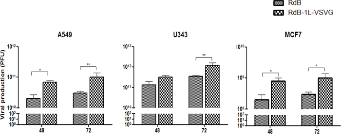 Figure 4: Viral production. Monolayers of A549 (5 MOI), U343 (5 MOI), and MCF7 (200 MOI) cells were infected with RdB or RdB-1L-VSVG. The total virus present in cell and supernatant was extracted at 48 and 72 hours post-infection and titers were determined by TCID50. Viral production assay was conducted at least three times, and data shown are representative experiments.