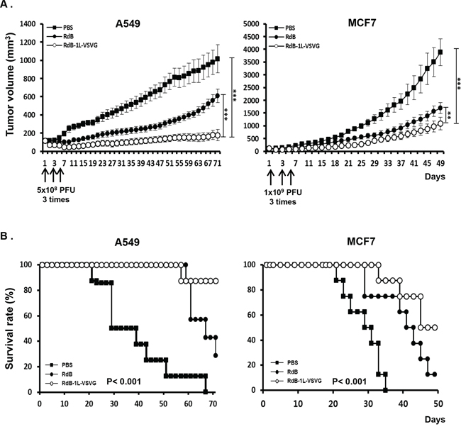 Figure 5: Anti-tumor effect and survival rate of oncolytic Ads in tumor xenograft model. Therapeutic efficacy of RdB or RdB-1L-VSVG against A549 and MCF7 tumors established in male athymic nude mice. Tumors were established by subcutaneous implantation of 1 × 107 cells and allowed to grow to an average size of 100 mm3. Animals with established tumors were randomized into three treatment groups of 7–8 animals each and treatment was initiated (day 1). Each group received intratumoral injection of PBS, RdB, or RdB-1L-VSVG (5 × 108 PFU for A549 and 1 × 109 PFU for MCF7) on days 1, 3, and 5 (vertical arrows). A. Evaluation of anti-tumor effect of VSVG-incorporating oncolytic Ads. Tumor growth was monitored on a 2 day interval by measuring the short and long length of the tumor. Tumor volume was estimated on the basis of the following formula: volume = 0.523 LW2. **P < 0.01, ***P < 0.001. B. Survival curve analysis of oncolytic Ads in tumor xenograft model. The percentage of surviving mice was determined by monitoring the tumor growth related events (A549; tumor size < 500 mm3, MCF7; tumor size < 1000 mm3) over a period.