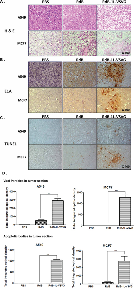Figure 6: Histological analysis of tumor tissue treated with oncolytic Ads. A549 and MCF7 tumors established in nude mice were injected with PBS, RdB, or RdB-1L-VSVG on day 1, 3, 5 and the tumors were harvested on day 7 for histological and immunohischemical analysis. A. H & E staining B. immunohistochemical staining of Ad E1A and C. TUNEL. Staining was performed in the sections of tumors treated with PBS, RdB, or RdB-1L-VSVG. D. Semi-quantitative analysis of E1A- or TUNNEL-stained sections using MetaMorph image analysis software. All results are shown as means ± STDEV. ***P < 0.001 compared with RdB.
