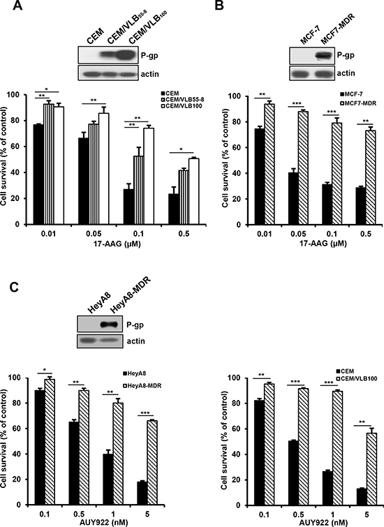 Figure 1: Differential cytotoxic effect of Hsp90 inhibitors in a range of cancer cell lines and their MDR variants. Human leukemic CEM A. human breast cancer MCF-7 B. and human ovarian cancer HeyA8 cell lines C. and their MDR variants overexpressing P-gp were treated with serial concentrations of 17-AAG or AUY922. Percentage of cell survival was determined after 96 h of incubation using MTT assay. Results are the means ± SEs of three experiments. *p < 0.05, **p < 0.01 and ***p < 0.001. Western blot analysis was performed to monitor the protein levels of P-gp and β-actin (actin) is used as a loading control of all cell lines.