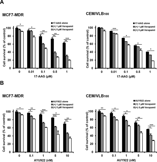 Figure 2: Potentiation of cytotoxicity of Hsp90 inhibitors in MDR cells by P-gp inhibitor verapamil. MCF-7/MDR or CEM/VBL100 cells were treated with serial doses of 17-AAG A. or AUY922 B. in the presence or absence of verapamil (1- and 5 μM). Percentage of cell survival was determined after 96 h of incubation using MTT assay. Results are the means ± SEs of three experiments. *p < 0.05, **p < 0.01 and ***p < 0.001.