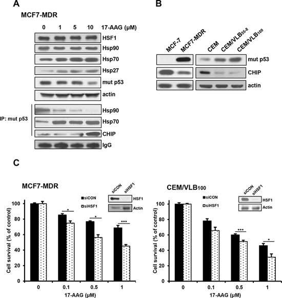 Figure 3: 17-AAG-mediated activation of HSF1/Hsps in MDR cells and enhanced cytotoxicity of MDR cells to 17-AAG by HSF1 inhibition. A. The changed levels of HSF1/Hsps and mut p53 in MCF7-MDR cells treated with serial doses of 17-AAG were determined by western blot analysis (upper panels). Cell lysates of MCF7-MDR cells treated with 17-AAG were immunoprecipitated with anti-p53 antibody and immunoblotted with anti-Hsp90, -Hsp70 and -CHIP. IgG was used as an internal control for the immunoprecipitation (lower panels). B. The basal protein levels of mut p53 and CHIP in MCF-7 and CEM cells and their MDR counterparts. C. MCF-7/MDR or CEM/VBL100 cells were transfected with 20 nM HSF1 siRNA (siHSF1) or scrambled siRNA for control (siCON). After 48 h of transfection, the cells were treated with serial concentrations of 17-AAG. Percentage of cell survival was determined after 96 h of incubation using MTT assay. Each bar represents the mean ± S.D. of triplicate experiments. *p < 0.05 and ***p < 0.001.