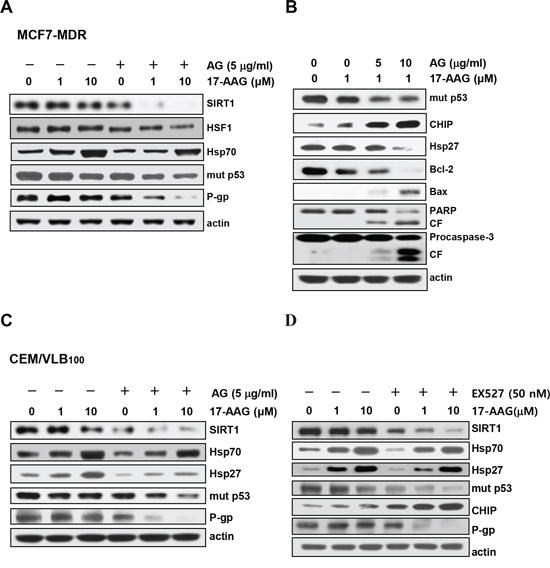 Figure 6: Potentiation of 17-AAG-mediated down-regulation of Hsps and mut p53/P-gp and activation of pro-apoptotic cascade by SIRT1 inhibitor. A. MCF7-MDR cells were pretreated with AG (5 μg/ml) for 6 h followed by 17-AAG (1 or 10 μM) for additional 24 h. Western blot analysis was performed to determine changed levels of SIRT1, HSF1/Hsp70, mut p53 and P-gp. B. MCF7-MDR cells were pretreated with AG (5 or 10 μg/ml) for 6 h followed by 17-AAG (1 μM) for additional 24 h, and the changed levels of mut p53, CHIP, Hsp27, Bcl-2, and Bax and the activation of PARP and procaspase-3 were determined by western blot analysis (right panels). CF, cleavage fragment. CEM/VBL100 cells were pretreated with AG (5 μg/ml) C. or EX527 (50 nM) D. for 6 h followed by 17-AAG (1 or 10 μM) for additional 24 h western blot analysis was performed to determine changed levels of SIRT1, Hsp70/Hsp27, mut p53, CHIP and P-gp.