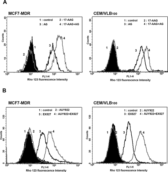 Figure 8: Effect of SIRT1 inhibitors on P-gp-mediated efflux activity of Hsp90 inhibitors in MDR cells. A. Cell suspension isolated from MCF7-MDR or CEM/VBL100 cells treated with 17-AAG (5 μM) in the presence or absence of AG (5 μg/ml) or for 12 h. B. Cell suspension of MCF7-MDR or CEM/VBL100 cells treated with AUY922 (0.01 μM) in the presence or absence of EX527 (50 nM) for 12 h. And then these are incubated with Rho123 and further incubated at 37°C for 4 h to allow P-gp-mediated efflux. Cellular fluorescence was analyzed immediately by using flow cytometer.