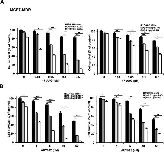 Figure 10: Potentiation of cytotoxicity of Hsp90 inhibitors in MCF7-MDR cells by SIRT1 inhibitors. MCF7-MDR cells were treated with serial doses of 17-AAG A. or AUY922 B. in the presence or absence of amurensin G (AG; 0.01- and 0.1 μg/ml) or EX527 (10- and 50 nM). Percentage of cell survival was determined after 96 h of incubation using MTT assay. Results are the means ± SEs of three experiments. *p < 0.05, **p < 0.01 and ***p < 0.001.