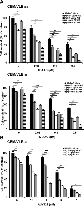 Figure 11: Effect of SIRT1 inhibitors on cytotoxicity of Hsp90 inhibitors in MDR variants of CEM cells. A. CEM/VBL55–8 and CEM/VBL100 cells, variants of CEM cells were treated with serial doses of 17-AAG in the presence or absence of amurensin G (AG; 0.01- and 0.1 μg/ml) or EX527 (10- and 50 nM). B. CEM/VBL100 cells were treated with serial doses of AUY 922 in the presence or absence of amurensin G (AG; 0.01~1 μg/ml) Percentage of cell survival was determined after 96 h of incubation using MTT assay. Results are the means ± SEs of three experiments. *p < 0.05, **p < 0.01 and ***p < 0.001.