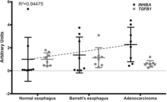 Figure 1: INHBA expression levels increase during the progression from normal esophagus to Barrett's esophagus and esophageal adenocarcinoma. Comparison of INHBA and TGFB1 expression was based on a publicly available GEO dataset (accession number GDS1321). Values for INHBA and TGFB1 were measured from extracted and purified RNA, shown here as arbitrary units. A trend line for INHBA expression (dashed line) was calculated (Y = 0.6436x + 0.2666). P-values for INHBA normal vs. BE, p = 0.248; NE vs. EAC, p = 0.932; BE vs. EAC, p = 0.437.