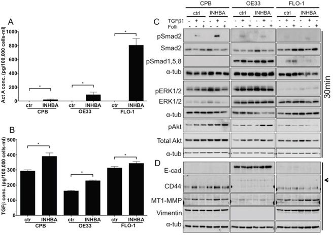 Figure 2: Overexpression of INHBA in esophageal model cell lines results in cell type specific alterations of canonical and non-canonical pathways. A. Activin A concentration in conditioned media after overexpression of Activin A (INHBA) compared to empty vector control was assessed by ELISA, and normalized to the cell number at time of collection. Highest overexpression levels were achieved in FLO-1 cells. B. TGFβ concentration in conditioned media after overexpression of Activin A (INHBA) compared to empty vector control as assessed by ELISA. C. Protein expression of pSmad2, total Smad2, pSmad1,5,8, pERK1/2 and total ERK1/2, as well as pAkt and Akt was analyzed by Western blot. D. Antibodies against markers of epithelial-mesenchymal transition showed the expression of mesenchymal markers, such as standard form of CD44, high MT1-MMP and vimentin in CPB and FLO-1. OE33 cells expressed the variant CD44 isoform (arrowhead) and had high E-cadherin (E-cad). * P value < 0.05