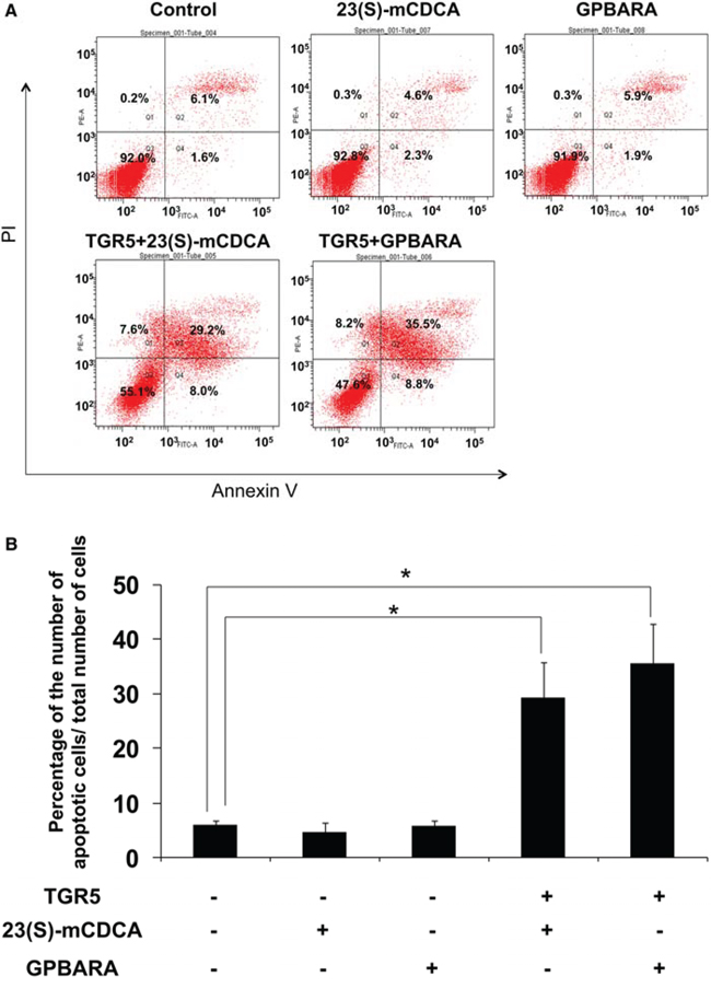 Next we test whether TGR5 activation induced gastric cancer cell apoptosis. The apoptotic effects of TGR5 activation were tested using Annexin V-FITC and Propidium Iodide (PI) apoptosis double staining. The results show that, compared with the control group, GPBARA or 23(S)-mCDCA treatment without TGR5 overexpression did not induce gastric cancer cell apoptosis. TGR5 overexpression with ligand treatment caused obviously apoptotic cell increase (The apoptotic cell percentages increased from 6.1 ± 0.5% in the control group to 35.5 ± 2.5% and 29.2 ± 3.1% for GPBARA and 23(S)-mCDCA treatment, respectively) (Fig. 2). These results suggest that TGR5 activation induced gastric cancer cell apoptosis.