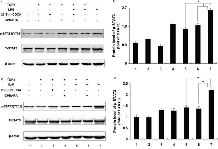 Figure 3: TGR5 inhibits STAT3 phosphorylation at Tyr705. A. TGR5 overexpression with ligand treatment suppressed LPS-induced phosphorylation of STAT3 at Tyr705 in SGC7901 cells. Cells were treated with ligand for 24 hours and then were treated with LPS for 6 hours. (n = 3) p-STAT3(Y705), phosphorylated STAT3 at Tyr705; T-STAT3, total STAT3. β-actin as a loading control. B. The data of relative protein levels in A. are expressed as fold change over the ratio of p-STAT3(Y705) to T-STAT3 in the control group (lane 1). C. TGR5 overexpression with ligand treatment suppressed IL-6-induced p-STAT3 at Tyr705 in SGC7901 cells. Cells were treated with ligand for 24 hours and then were treated with IL-6 for 6 hours. (n = 3) p-STAT3(Y705), phosphorylated STAT3 at Tyr705; T-STAT3, total STAT3. β-actin as a loading control. D. The data of relative protein levels in C. are expressed as fold change over the ratio of p-STAT3(Y705) to T-STAT3 in the control group (lane 1). *P < 0.05.