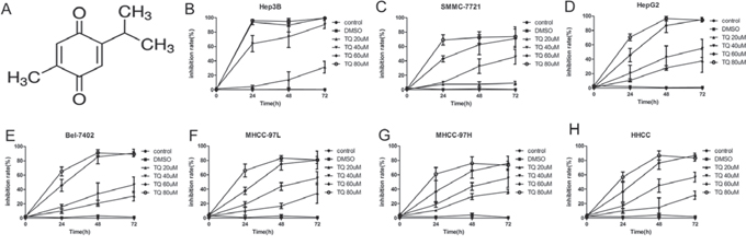 Figure 1: TQ inhibits proliferation HCC cell lines. A. Chemical structure of TQ. B-H. Cell inhibition rate after TQ treatment relative to the controls. HCC cells were cultured in 96-well plates with ascending doses of TQ (20–80 μM) for 24, 48 and 72 h, cell viability was evaluated by MTT assay, the inhibition rate was calculated by formula: (1-treated group/control group) × 100%.