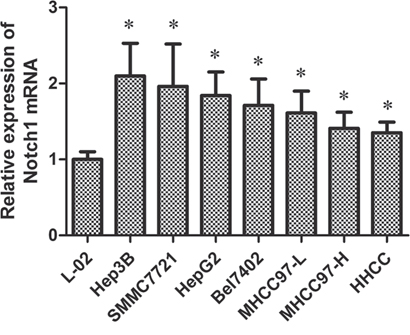 Figure 2: Notch1 mRNA activity in seven HCC cell lines and a normal liver cell for qRT-PCR. *p < 0.05.