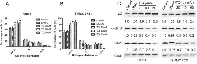 Figure 3: TQ induces G1 phase cell cycle arrest; p21, cylinD1 and CDK2 protein expression in Hep3B and SMMC7721 cells. Cells were incubated with various concentrations of TQ for 48 h. Cell cycle distribution was analyzed by flow cytometry. A. Proportion of cell population in Hep3B; B. cell distribution in SMMC7721. Results are represented as the means ± SE (n = 3), *p < 0.05 vs control and DMSO group. C. Expression of cell cycle-related protein (above-mentioned) and β-actin proteins was determined by western blot analysis.