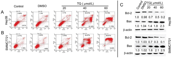 Figure 4: TQ induced cell apoptosis and effect on apoptosis-related factors. Cells were stained with AnnexinV and PI, following the quantitative analysis of apoptosis in A. Hep3B cells and B. SMMC7721 cells by flow cytometry. C. TQ decreases expression of Bcl-2 and increases Bax level, with Bcl-2 and Bax measured using western blot analysis.