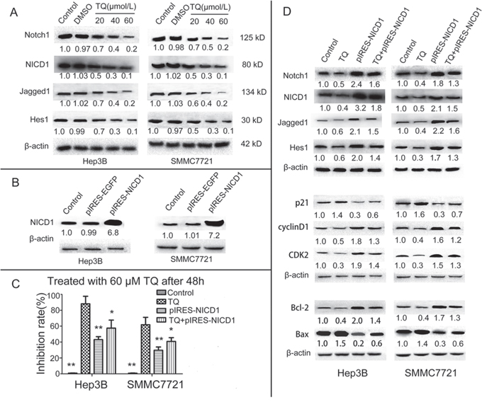 We hypothesized that TQ-induced growth suppression of HCC cells could be related to the Notch signaling pathway. To confirm this possibility, we determined the effects of TQ on Notch signaling in Hep3B and SMMC7721 cells. Western blotting demonstrated that TQ inhibited the expression of Notch1, NICD1, Jagged1 and Hes1 in a concentration-dependent manner (Fig. 5A). To further elucidate the role of Notch1 in the TQ response, we transfected Hep3B and SMMC7721 cells with pIRES-NICD1-EGFP vector, expressing human NICD1. Initial testing verified that transfection of these cells with this vector successfully and significantly promoted overexpression of NICD1 (Fig. 5B). We then explored whether the inhibitory effect of TQ on cell growth and expression of cell cycle-related and apoptosis-related proteins was related to suppression of Notch signaling. After transient transfection with the NICD1 vector for 6 h, Hep3B and SMMC7721 cells were incubated in the presence or absence of TQ (60 μM) for 48 h. The cells were then subjected to in vitro MTT assays and WB analysis. Results showed that forced overexpression of NICD1 reversed the inhibitory effects of TQ on cell growth. MTT assay results in control, TQ, pIRES-NICD1 and TQ+pIRES-NICD1 groups were 0.9 ± 0.1, 88.15 ± 9.48, 43 ± 3.81, and 57.5 ± 10.1 in Hep3B cells, respectively, while corresponding values were 0.8 ± 0.2, 61.79 ± 9.35, 29.7 ± 4.1, and 40.8 ± 4.75 in SMMC7721 cells, respectively (Fig. 5C). WB revealed that forced NICD1 overexpression caused attenuation of TQ's inhibitory effects on expression of Notch1, Jagged1, Hes1, cyclinD1, CDK2 and Bcl-2, as well as on TQ-induced upregulation of p21 and Bax (Fig. 5D). These results suggest that TQ inhibits tumor cell growth via cell cycle arrest and apoptosis, induction at least in part due to repression of Notch signaling.