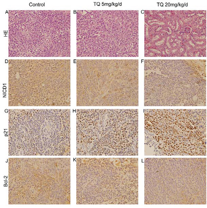 In order to verify our in vitro observation and to evaluate the anti-tumor efficacy of TQ in vivo, we analyzed its influence on the growth of liver tumor xenografts in athymic nude mice. TQ (5 mg/kg/d and 20 mg/kg/d) was administered subcutaneously (s.c.) beginning when Hep3B tumors reached 150 mm3. As shown in Fig. 6A, TQ treatment caused a statistically significant tumor volume decrease vs. the control group (p < 0.01) at day 31: the average tumor volumes in TQ-treated (5mg/kg/d or 20 mg/kg/d) vs. solvent-treated control mice were 710 ± 37.6 or 537 ± 32.5 cm3 vs. 1022.3 ± 387.1 cm3, respectively (p < 0.05). There was no statistical difference in average body weights (22.6 ± 2.9 g in the 5mg/kg/d group and 21.1 ± 3.2 g in the 20mg/kg/d group vs. 23.5 ± 4.1 g in controls), indicating that TQ exerted no obvious deleterious side effects in tumor-bearing mice. Fig. 6B-6C shows that tumor sizes and weights in TQ-treated mice were significantly smaller than in solvent-treated mice. In addition, H&E staining of the control and 5 mg/kg/d TQ-treated groups confirmed that tumor xenografts had been successfully established in both groups (Fig. 7A-7B). H&E staining of kidney epithelial cells in the 20 mg/kg/d TQ-treated group revealed normal histology (Fig. 7C), further establishing that TQ exerted minimal toxicity. We next investigated whether TQ-inhibited tumor growth in mice was associated with inactivation of the Notch pathway and expression of p21 and Bcl-2, as in cultured cells. Immunohistochemical staining of tumor tissue revealed that TQ treatment at the doses of 5mg/kg and 20mg/kg increased the expression of p21 protein, while this treatment inhibited the expression of NICD1 and Bcl-2 vs. controls (Fig. 7D-7L). Overall, these observations demonstrate that TQ inhibits the growth of HCC cells both in vitro and in vivo, associated with reduced activity of the Notch signaling pathway and induction of cell cycle arrest and apoptosis.