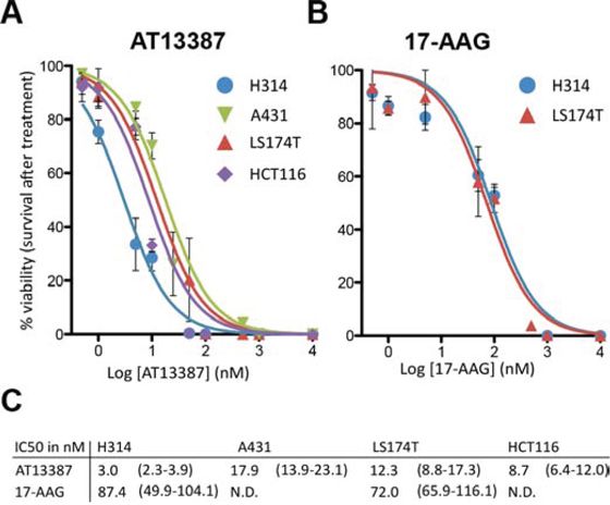 Figure 1: Dose response curves and IC50 analysis. A. AT13387 treatment on H314, LS174T, A431 and HCT116 cells and B. 17-AAG treatment on H314 and LS174T cells. 7–21 days after drug exposure, colonies of more than 50 cells were counted. The error bars represent the standard deviation (n ≥ 4–8). C. Summary of the IC50 values (in nM) of the investigated cell lines with 95% confidence interval in parenthesis.