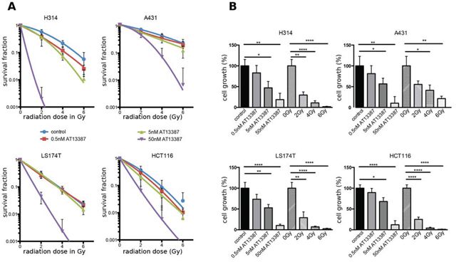 Figure 2: Clonogenic survival assays. A. Dose response curves of H314, A431 LS174T, HCT116 and cells treated with AT13387 (0.5, 5, 50 nM) and radiation (2, 4 and 6 Gy). The cells were pre-plated in triplicates, incubated with AT13387 24 h later and irradiated 1 h after drug incubation. Colonies with > 50 cells were counted. The error bars represent the standard deviation (n ≥ 6–12). All curves are normalized to the plating efficiency of the non-irradiated controls. B. Effects of the AT13387 and radiation alone as measured by inhibition in cell growth (%) of the dataset in A), evaluated with Student's t-test with *p < 0.05, **p < 0.01, ***p < 0.001.