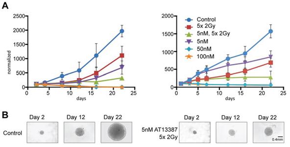 Figure 3: Multicellular tumor spheroid growth. A. H314 spheroids and HCT116 spheroids treated with AT13387 (5 nM, 50 nM, 100 nM), 5 times 2 Gy radiation fractions and combination treatment of 5 nM AT13387 and radiation. 1000–3000 cells were pre-plated in an agarose coated 96-well plates, incubated with AT13387 after 24 h and irradiated 1 h after drug incubation. The error bars represent standard deviation n ≥ 3. All curves are normalized to the size of controls at day 1. B. Example of H314 spheroids after 2, 12 and 22 days.