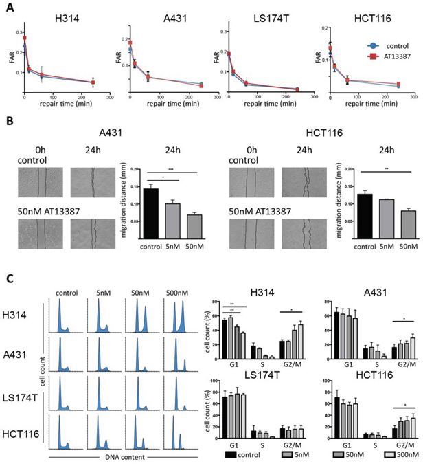 Figure 4: DNA DSB rejoining capacity and migration distance and cell cycle analysis. A. PFGE analysis. H314, A431, LS174T and HCT116 cells were exposed to 200 nM AT13387 for 24 h prior to irradiation. After irradiation, cells were allowed to repair. Kinetics of DSB end rejoining was calculated by fraction of activity released (FAR) corresponding to DNA of sizes < 5.7 Mbp. The error bars represent standard deviation, n = 4. B. Cell migration assay. Left hand images represent photographs of A431 and HCT116 cultures taken at 0 h (immediately after scratching) and at 24 h with and without AT13387 treatment. The graphs show quantification of the wounded area invaded after 24 h, measured in migrated distance in mm. The error bars represent standard deviation, n ≥ 3. Student's t-test was used to calculate statistics: *p < 0.05, **p < 0.01, ***p < 0.001. C. Flow cytometry evaluation of cell cycle progression. Left hand histograms show representative data of DNA content as stained by DAPI/PI indicating the progression from G1 through S and to G2/M phases. Increasing concentrations of AT13387 increases the G2/M peak and depletes the S phase. Right hand side shows quantification of flow cytometry data and statistical significance from ANOVA with Tukeys post-test.