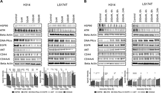 Figure 5: Effect of AT13387 treatment on HSP90 client protein levels (HSP90, ATM, DNA-PKcs, EGFR, AKT, CD44, CD44v6). A. Dose-dependent downregulation of client proteins. H314 cells and LS1474T cells treated with the indicated doses of AT13387 for 24 h. B. Recurrence of protein level after AT13387 treatment. H314 and LS174T cells were treated with 200 nM AT13387 for 24 h. After drug treatment cells were kept in drug-free complete medium for 0, 4, 8 and 24 h. Lysates were harvested and equivalent amounts of protein from each lysate were resolved by SDS-PAGE and immunoblotting with the indicated antibodies. The expression levels of beta actin were used to ensure equal loading. Above: Representative Western blots, Below: Western blot quantification. Protein levels were normalized to beta actin, and were normalized to the level of untreated control (dashed line). One way-ANOVA with Bonferroni post-test was used to calculate statistics: *p < 0.05, **p < 0.01, ***p < 0.001, ****p < 0.0001. Error bars represent the standard deviation, n = 3–6.