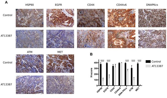 Figure 6: Immunohistochemical analysis on A431 tumors. A. Representative images of ex vivo immunohistochemical staining for HSP90, EGFR, CD44, CD44v6, DNA-PKcs, ATM and MET expression in A431 tumor xenografts (magnification × 10). Mice in the treatment group (n = 6) received 5 doses of 50 mg/kg AT13387 on 5 consecutive days before dissection and analysis. The effect of AT13387 was highest on the expression pattern of HSP90, EGFR and MET. B. Semiquantitative analysis of immunostainings using the H-score method. Error bars represent the standard deviation, n = 16. One way-ANOVA with Bonferroni post-test was used to calculate statistics: *p < 0.05, **p < 0.01, ***p < 0.001, ****p < 0.0001.