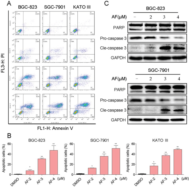 Figure 2: AF induces apoptosis in human gastric cancer cells. A. Induction of apoptosis in human gastric cancer cells was determined by flow cytometry after treatment with AF (2, 3 or 4 μM) for 24 h. Similar results were obtained in three independent experiments. B. The percentage of apoptotic cells in the treatment groups was calculated (*p < 0.05, **p < 0.01). C. BGC-823 or SGC-7901 cells were treated with AF (2, 3 or 4 μM) for 20 h. Whole-cell lysates were subjected to western blot to assess the expression of cell apoptosis related proteins. GAPDH was used as internal control. Data represent similar results from three independent experiments.