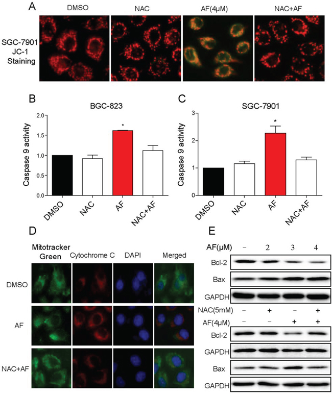 Figure 6: AF activates mitochondrial apoptotic pathway. A. Treatment of cells with AF obviously decreased the mitochondrial membrane potential (Δψm). SGC-7901 cells after treatment AF (4 μM) for 14 h were stained with JC-1 and then analyzed by fluorescence microscope. B–C. Caspase-9 activity. Cells after treatment with AF for 20 h were lysed and cell proteins were used to determine caspase-9 activity with assay kit using specific substrate. D. Treatment with AF provoked the release of cytochrome C from mitochondria into cytosol. SGC-7901 cells after treatment AF (4 μM) for 14 h were stained with Mito-T green fluorescence, anti-cytochrome C and DAPI for detecting the translocation of cytochrome C from the mitochondria to the cytosol. E. Western blot analysis effects of AF on expression of Bcl-2 family proteins in SGC-7901 cells. A–E. NAC significantly reversed the activation of mitochondrial apoptotic pathway induced by AF. All images shown here are representative of three independent experiments with similar results.
