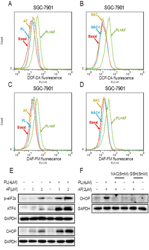 Figure 7: PL enhances AF-induced intracellular ROS accumulation and ER stress response. A and C. PL enhances AF-induced intracellular ROS accumulation. Intracellular ROS levels were measured in SGC-7901 cells by staining with DCFH-DA (10 μM) or 4-amino-5-methylamino-2′,7′-difluorofluorescein (DAF-FM) diacetate (5 μM) and flow cytometry analysis. B and D. NAC blocked combined treatment-induced intracellular ROS accumulation. SGC-7901 cells were pre-incubated with 5 mM NAC for 2 h before combined treatment for 2 h. Intracellular ROS levels were measured by flow cytometry. E. PL enhances AF-induced ER stress response. SGC-7901 cells after treatment were collected and lysed, the protein levels of p-eIF2α, ATF4 and CHOP were determined by western blot. GAPDH was used as internal control. F. NAC or GSH addition reversed combined treatment-induced ER stress response. All images shown here are representative of three independent experiments with similar results.