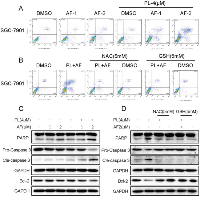 Figure 8: PL enhances AF-induced apoptosis in SGC-7901 cells. A. PL enhances AF-induced apoptosis in SGC-7901 cells. Cells after treatment were collected and stained Annexin-V/PI, percentage of cell apoptosis was determined by flow cytometry, and ROS scavengers prevent SGC-7901 cells from combined treatment-induced cell apoptosis B. C. PL enhances AF-induced expression of cell apoptosis related proteins. Cells after treatment for 20 h were lysed, and the expression of apoptosis related proteins were detected by western blot. D. NAC or GSH addition reversed combined treatment-induced expression of apoptosis related proteins. Data presented are representative of three independent experiments.