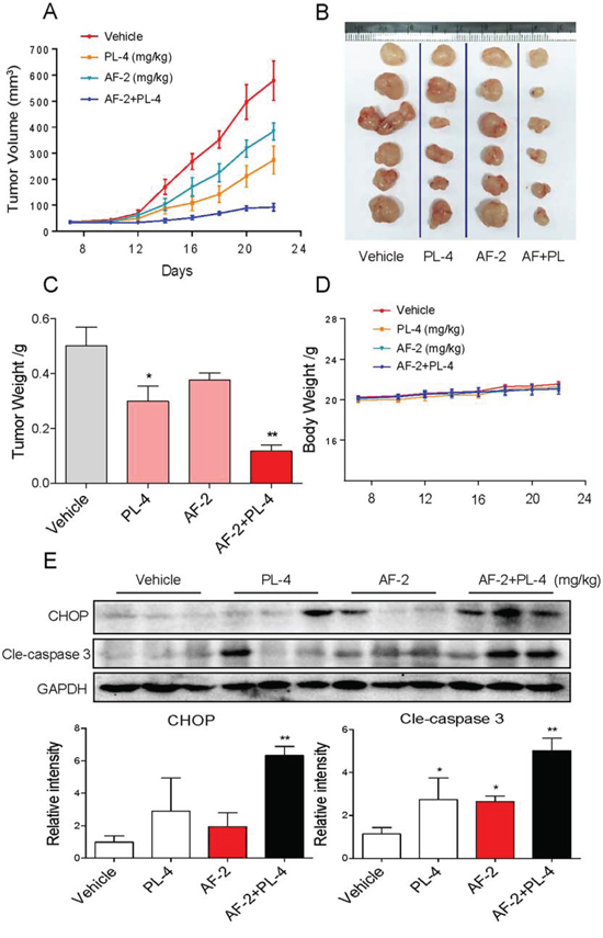 Figure 9: PL enhances AF-induced growth inhibition of tumor xenografts. Combined treatment inhibits tumor volume A and B. and tumor weight C. of SGC-7901 human gastric cancer xenografts in nude mice, but do not affect body weight D. of mice. E. Western blot analysis on the expression of CHOP and caspase3 cleavage from respective tumor tissue lysates. GAPDH was used as protein loading control. Protein levels were quantified by Image-Pro Plus 6.0. (*p < 0.05, **p < 0.01).
