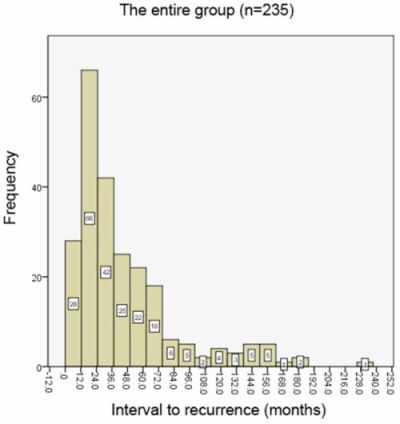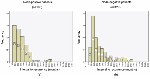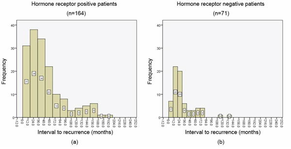 We demonstrated a median ITR of 33 months for the entire group, which is roughly similar to previous reports. The analyses by nodal and HR status show that node-negative and HR-positive patients take a longer interval to develop recurrences. This observation provides further evidence supporting the above-mentioned findings that node-negative and HR-positive subgroups experienced more frequency of recurrences in late follow-up.