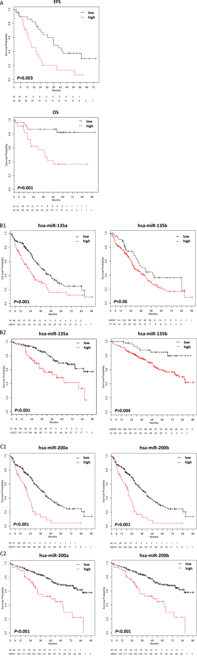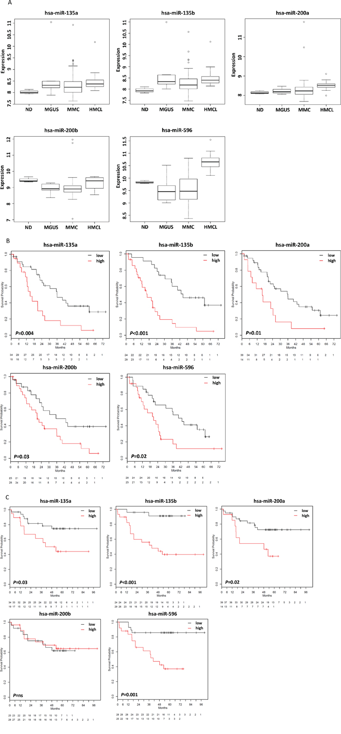 Given their biological significance, we investigated whether this transmits into and/or parallels survival relevance. Indeed, a comparably high number of miRNAs was significantly associated with survival. Those remaining significant after correction for multiple testing, i.e. miR-135a, miR-135b, miR-200a, miR-200b, and miR-596, have recently been published to play a role in solid tumors and hematologic cancers, respectively, e.g. functioning as either oncogenes or tumor-suppressors and prognostic markers [44–48]. In myeloma, a high expression of these miRNAs delineates a group of patients with inferior survival. The same holds true if a miRNA-signature is build based on these miRNAs. Associations with proliferation, chromosomal aberrations, and gene expression-based high-risk could be possible explanations. Indeed, a high expression of miR-135a, miR-135b, and miR-596 is significantly associated with a t(4;14), miR-596 also with del13q14. Although patients with a high expression of miR-596 and miR-200a show a significantly higher GPI which is in turn associated with 1q21-gain [3], no association with this aberration could be found. Except for miR-200b, all survival relevant miRNAs show also a significant association with gene expression-based risk-scores [38, 39]. For miRNA-135b and miR-596, samples with a high expression were significantly more frequent in the particular high-risk group. As all GPIhigh-patients showed a high miR-596-expression, miR-596 is not only linked to survival and high-risk disease in terms of chromosomal aberrations, tumor mass, and the UAMS-score [38], but also to proliferation, one of the strongest independent risk-factors in myeloma [3]. Besides these associations, published data also suggest a possible role in angiogenesis as shown for exosomal miR-135b derived from myeloma cells which enhances angiogenesis by targeting factor-inhibiting HIF-1 [49], or myeloma bone disease, with miR-135b, being upregulated in mesenchymal stromal cells from myeloma patients, being involved in an impaired osteogenic differentiation process [21]. Next, we investigated whether the signature of regulated genes impacts on survival, which is the case (Figure 3B, C).