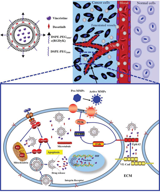 Figure 1: Schematic design and mechanism of functional vincristine plus dasatinib liposomes for the treatment of TNBC and VM channel elimination. Notes: During hypoxic conditions, the transcription of VE-Cad is increased, and EphA2 is subsequently re-localized to the cell membrane and phosphorylated. Phosphorylated EphA2 directly activates PI3K or initiates the activation of FAK and downstream PI3K. Activated PI3K, in turn, activates MMPs (MMP-2 and MMP-9), which eventually results in VM channel formation. Functional vincristine plus dasatinib liposomes specifically bind to integrin receptors on cancer cells. The internalized liposomes induce the apoptosis of cancer cells through a cascade of apoptotic reactions via the activation of caspase 8, 9, and 3, the increased expression of the pro-apoptotic protein Bax, the decreased expression of anti-apoptotic protein Mcl-1, and generation of ROS. Furthermore, they destroy VM channels via the decreased expression of VE-Cad, FAK, PI3K, MMP-2 and MMP-9.