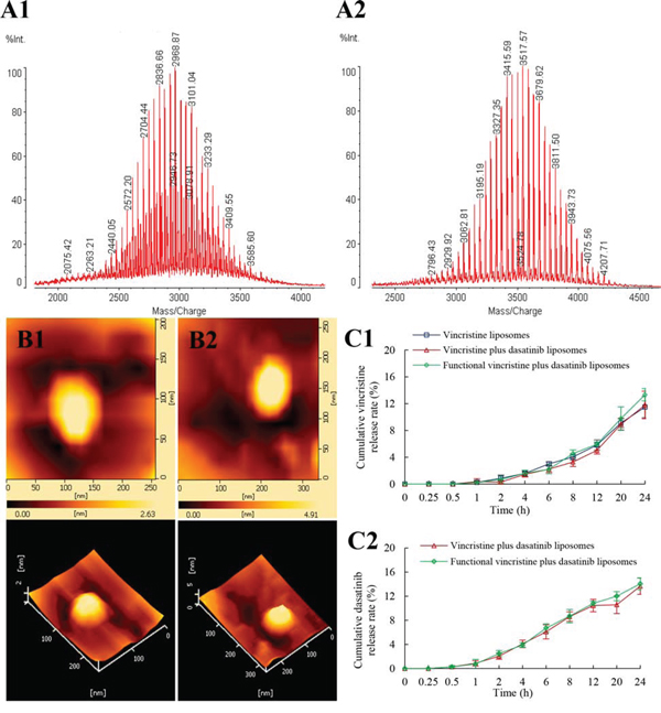 Figure 2: Characterization of targeting molecules and functional vincristine plus dasatinib liposomes. Notes: MALD-TOF-MS spectra of (A1) DSPE-PEG2000-NHS and (A2) DSPE-PEG2000-c(RGDyK) targeting molecule. AFM images of (B1) vincristine liposomes and (B2) functional vincristine plus dasatinib liposomes. Release rates of (C1) vincristine and (C2) dasatinib from the liposomes. Data are presented as the mean ± SD (n = 3).