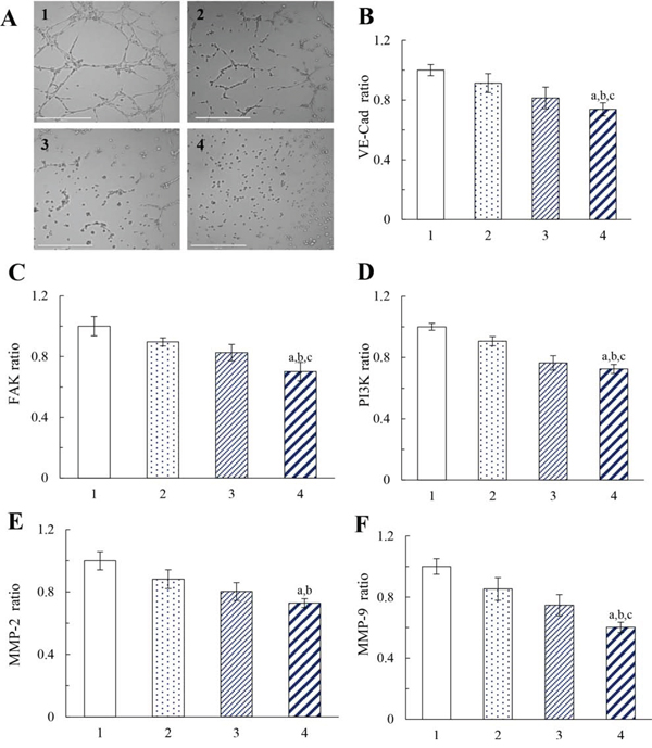 Figure 6: Destructive effects on the VM channels of MDA-MB-231 cells after treatment with functional vincristine plus dasatinib liposomes. Notes: A. Destructive effects on the VM channels. Inhibitory effects on the VM channel indicators, including B. VE-Cad, C. FAK, D. PI3K, E. MMP-2, and F. MMP-9. Data are presented as the mean ± SD (n = 3). 1, blank control; 2, vincristine liposomes; 3, vincristine plus dasatinib liposomes; 4, functional vincristine plus dasatinib liposomes. p < 0.05, a, vs. 1; b, vs. 2; c, vs. 3.